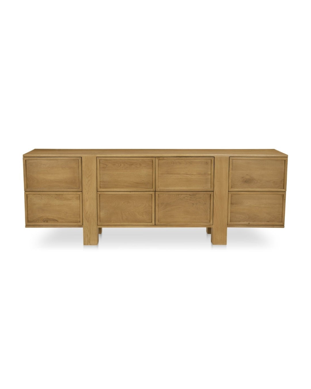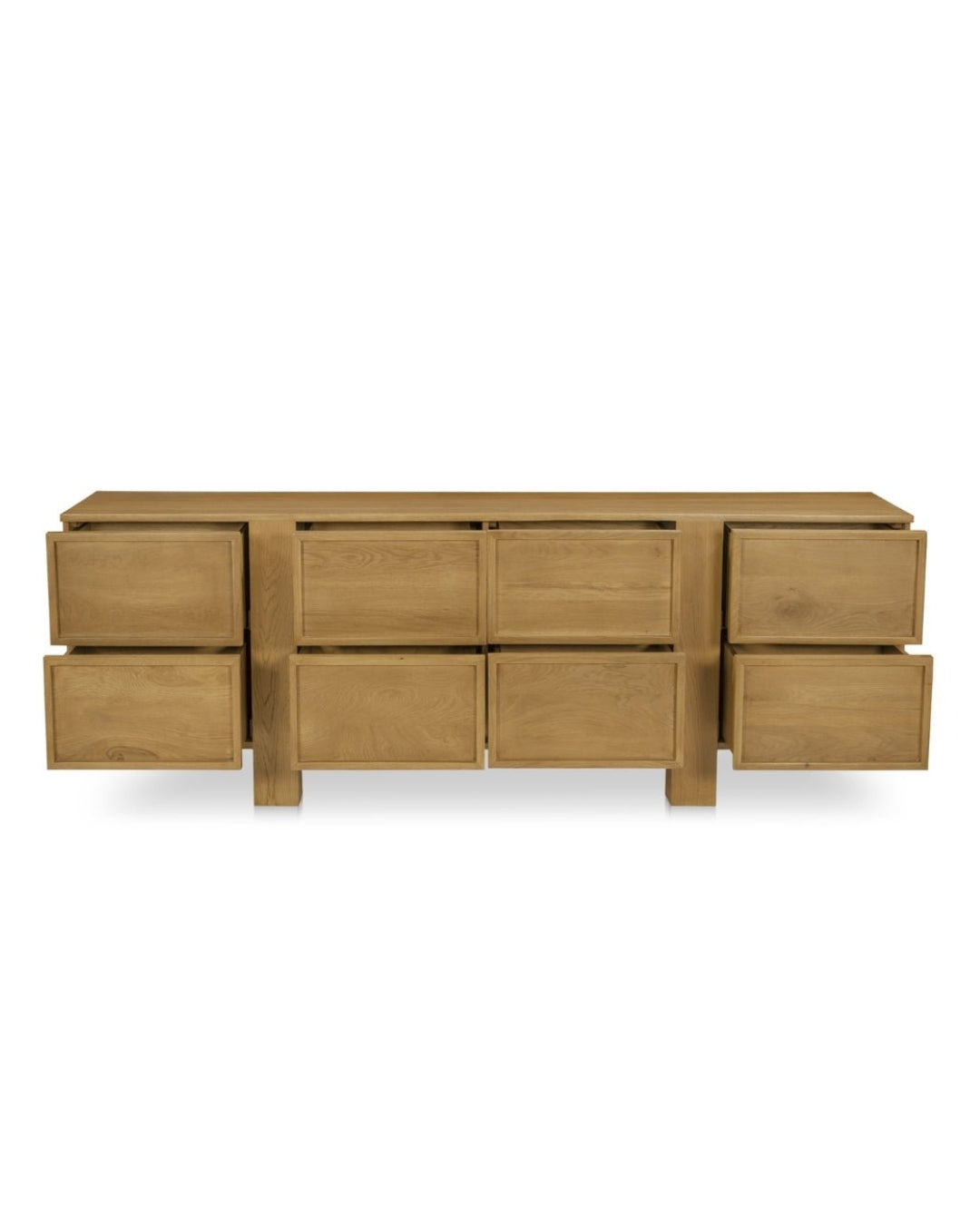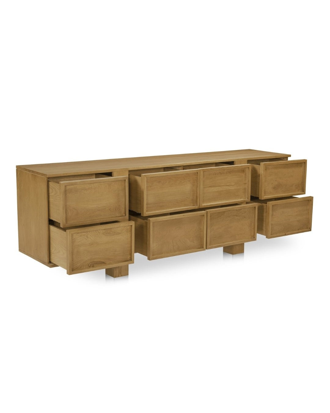The Yngvi dresser is a solid oak piece with oak veneer panels and eight soft-close drawers that run on undermounted glides for a sleek appearance and smooth operation. Inspired by traditional Japanese tansu, the design emphasizes functionality and a soft design, achieved through tall legs and a balanced frame. Each unit has its own grain pattern and tone—natural variation is to be expected. It comes fully assembled; no setup is needed.