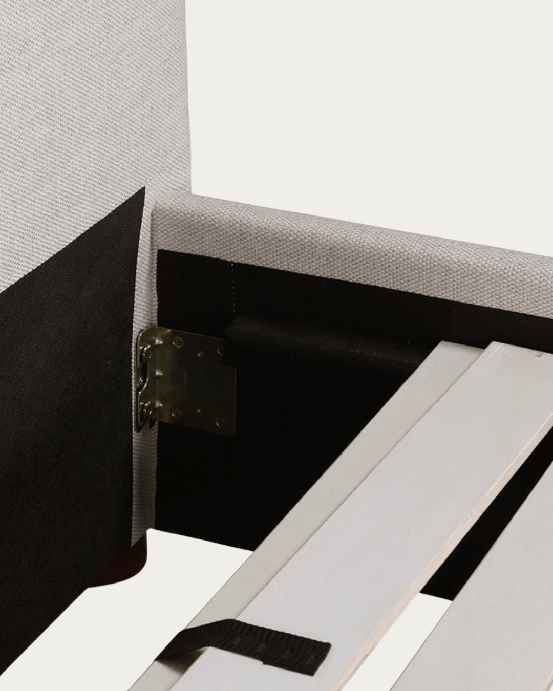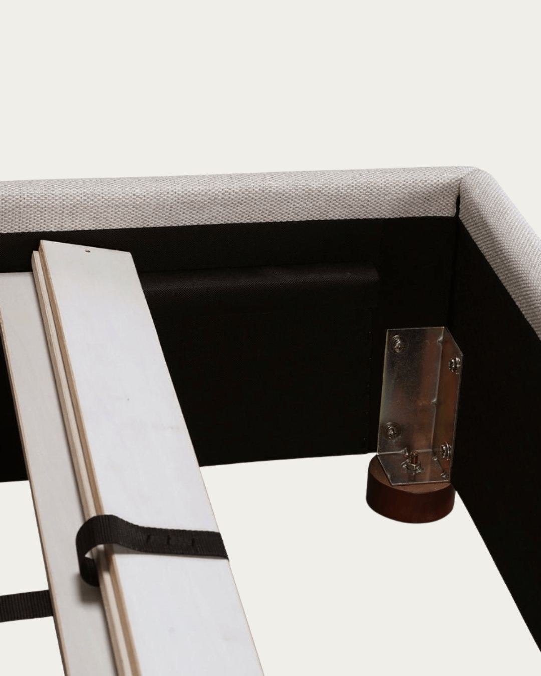 The Bjorn bed, made of a polyester-linen blend, keeps things simple. It has a tall padded headboard for sitting up and a pine-engineered wood frame that doesn’t wobble. Slats are included to help keep your mattress sturdy. No need for a box spring. Compatible with an adjustable base—simply remove the slats and insert. Assembly is required.