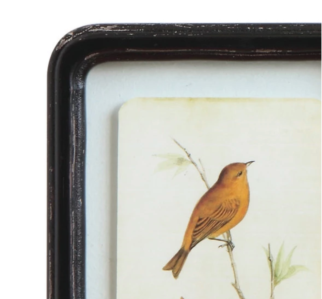 Brighten any room with these bird prints. Each one has a distressed black finish frame and glass front. Sold individually. These go perfectly with some of our other vintage inspired wall art. See items below.