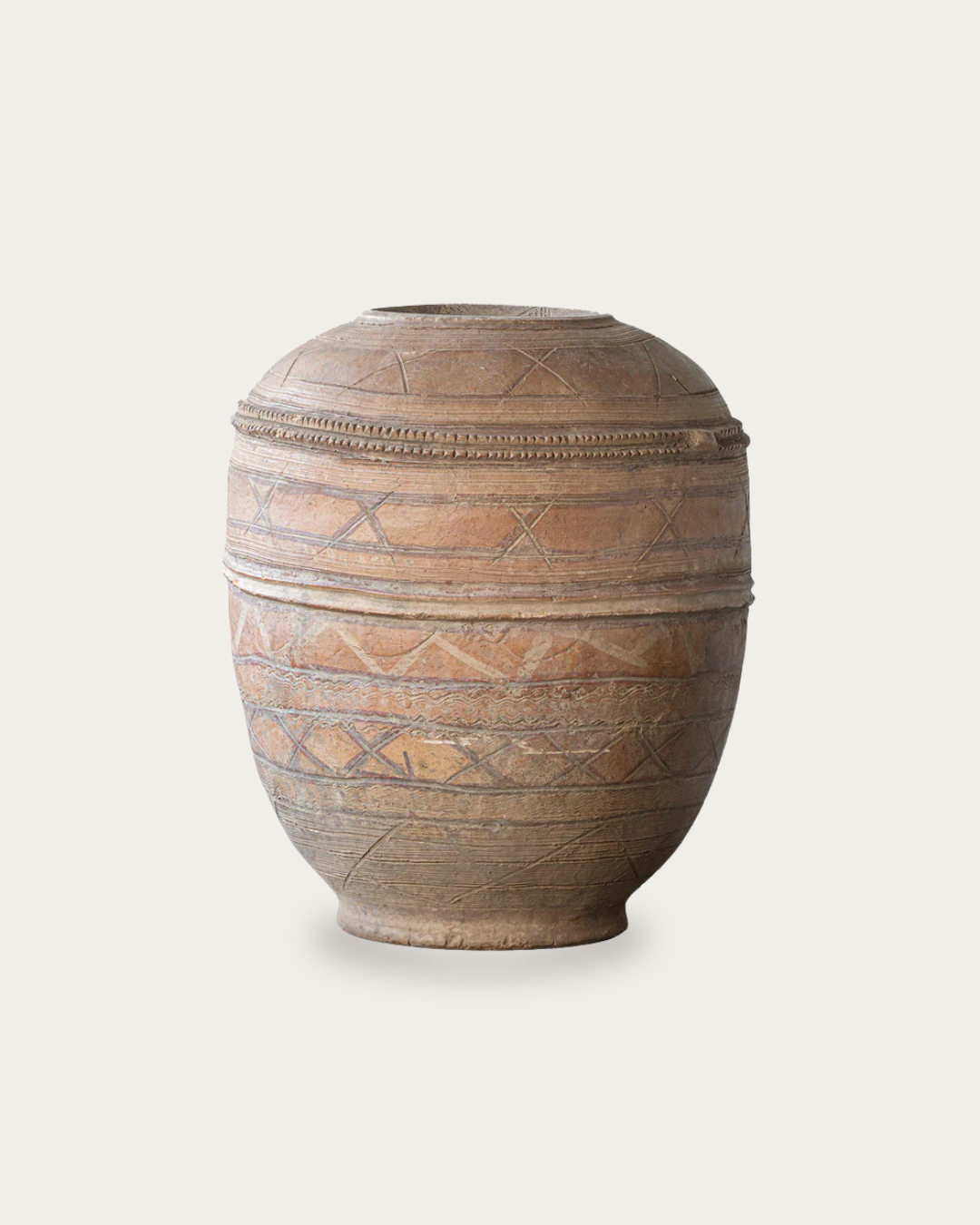 The African Nupe Jar takes its form from traditional water vessels used by the Nupe people of Nigeria. Made from clay and hand-etched the jar features a rounded body with a tapered opening keeping the silhouette practical and direct. Finished in a natural clay tone it works as a standalone object or grouped with other vessels on shelves, consoles or low tables—an easy way to introduce material history and form without turning the piece into decor for decor’s sake.