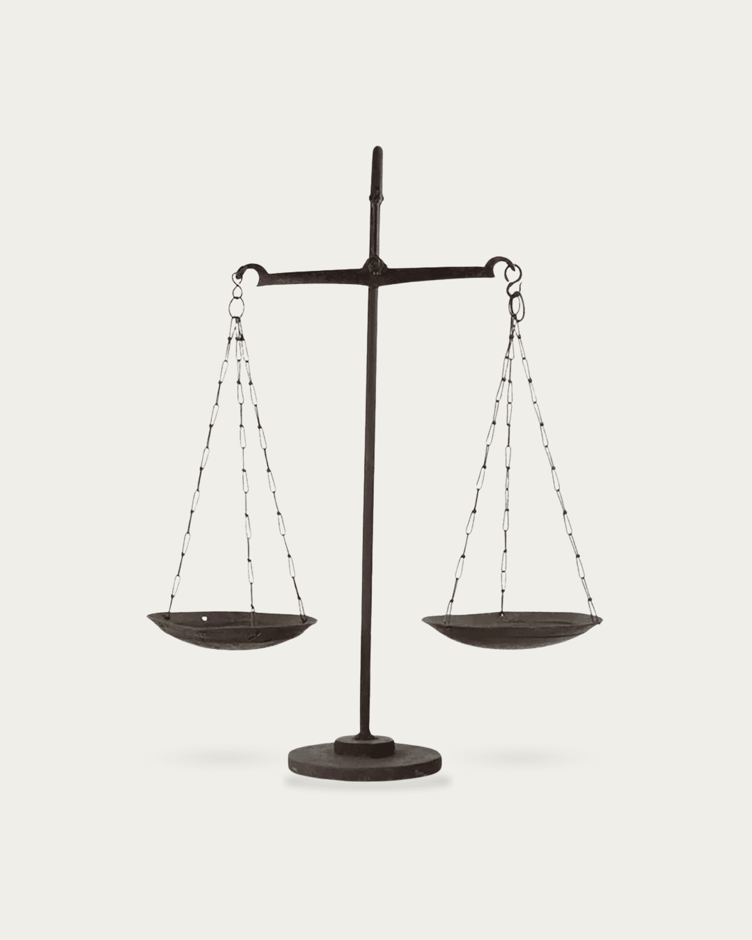 This vintage weight scale once settled deals—spices, metals, whatever was on the table. The iron base is newly reconstructed, but the arms and pans are the real thing, pulled from trade markets across India. It’s all function-meets-form, even if you’re just using it to hold air plants or stage your shelf. Each piece varies in size, shape, and wear—because it should. Fits into any vintage decor home setup that leans more storied and less polished.