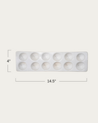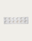 Our Fenja egg holder turns a kitchen staple into something worth leaving out. Carved in stoneware and finished with a reactive white glaze that moves differently across each piece, it holds a dozen eggs with quiet weight. Long and low in form, it shifts easily from counter to table—part storage, part serving ritual. The heft of stoneware grounds it, giving even everyday routines a sense of permanence.