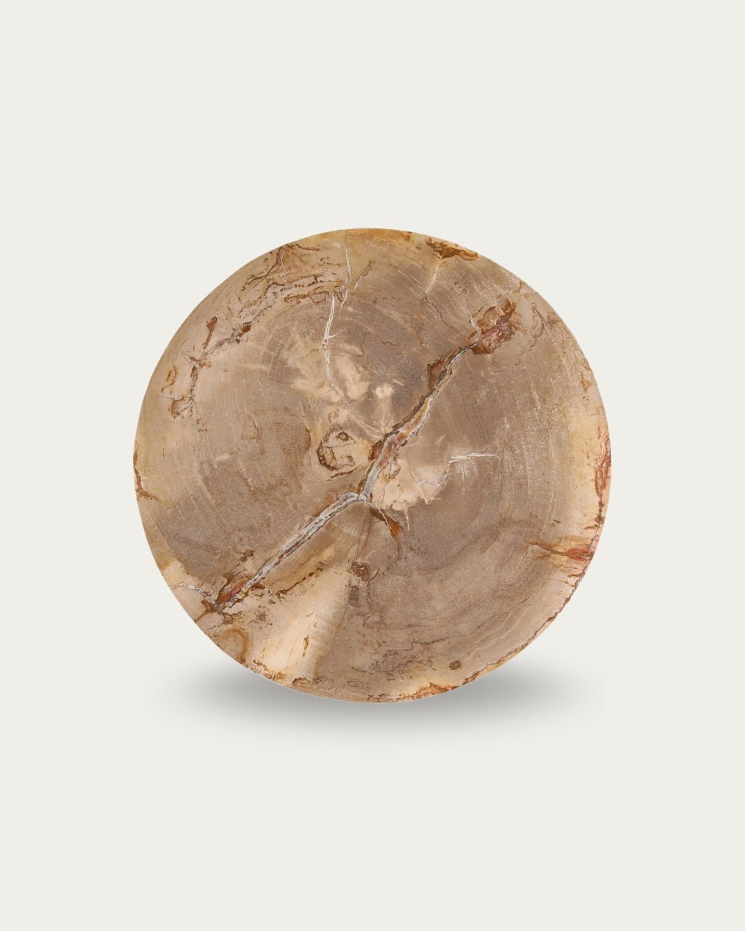 The Vidkun side table pairs a petrified top with a bronze-finished steel base, creating a round wood side table that balances natural texture with refined metal. The mix of raw texture and polished metal gives it balance—functional beside a sofa, expressive as a sculptural accent in an entryway. Each one varies naturally, ensuring no two are alike.