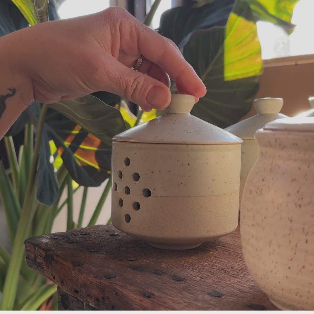 The Kara Stoneware Garlic Keeper is your solution to keeping garlic fresh and your counters clutter-free. Made from speckled stoneware pottery, this large holder has vented sides to promote airflow, helping extend the life of your garlic while adding a vintage touch to your kitchen. Pair it with other pieces from our Kara line below for a cohesive and functional setup that works as hard as you do.
