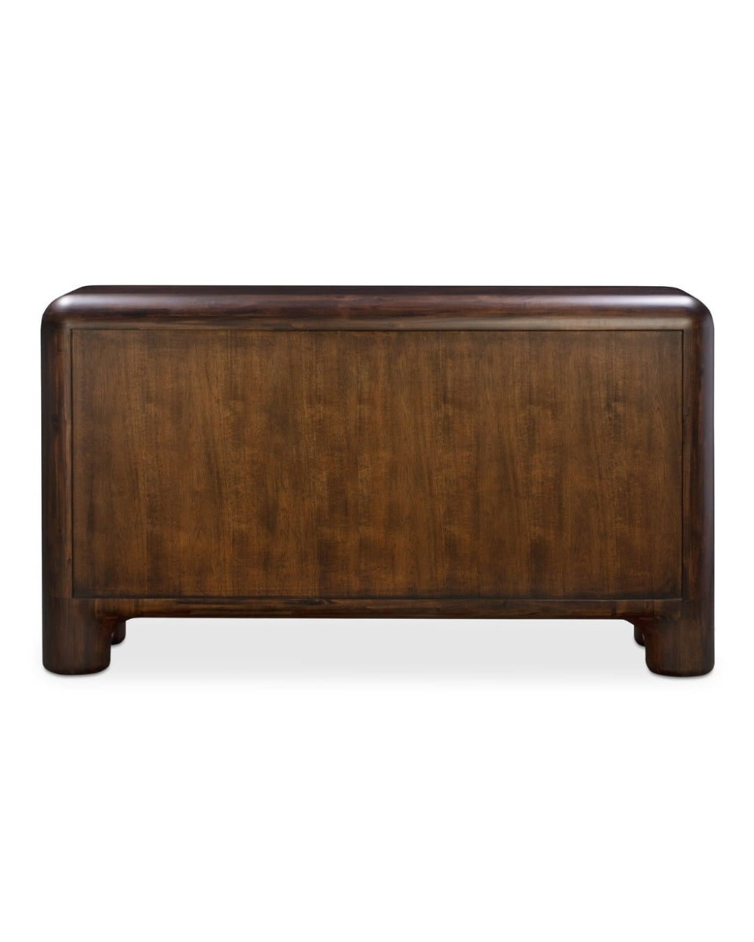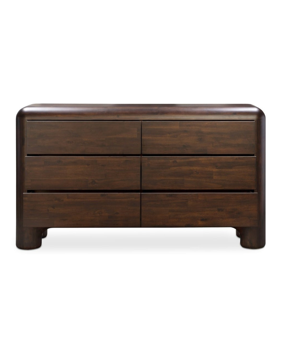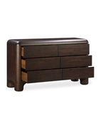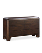 The Vignir dresser is built from solid wood, with MDF and veneer used on the back and drawer panels, finished in a walnut stain that highlights the natural grain. It stands on wide, rounded legs and includes six drawers that open smoothly on soft-close metal glides. Natural variations in the wood grain make each piece one of a kind. It comes fully assembled and ready to use—no setup needed.