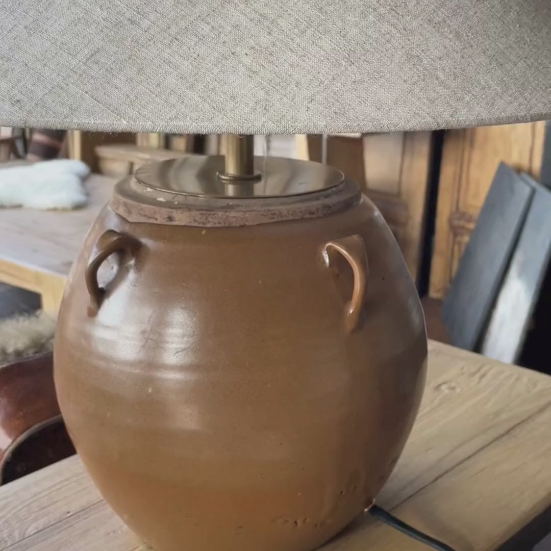 Another amazing reimagined vintage pot turned lamp to round out our collection. The vintage clay pots used for the base of this lamp are handmade and sourced from villages in China. Each lamp is topped with a taupe linen empire shade and support a 60W bulb.