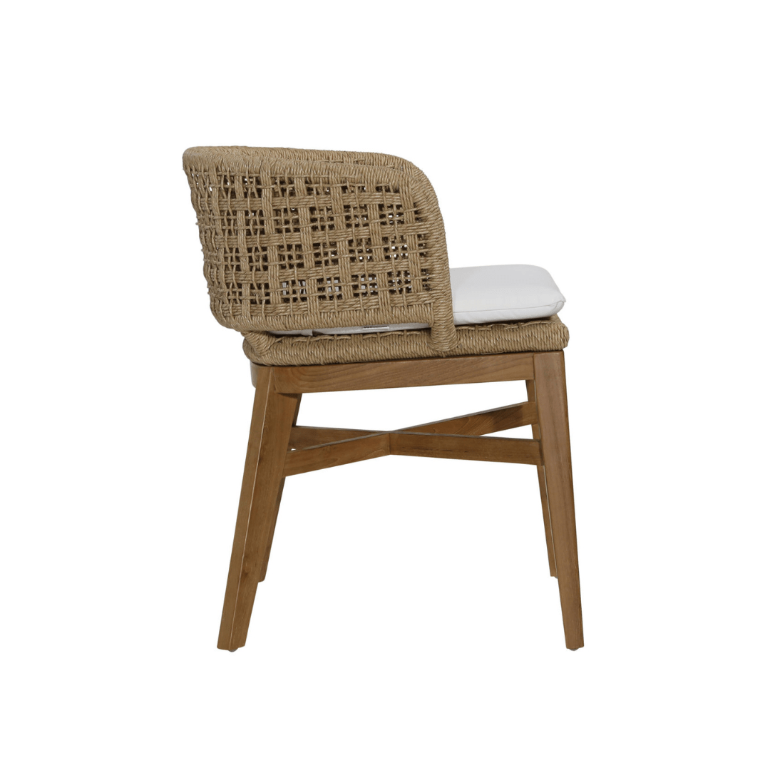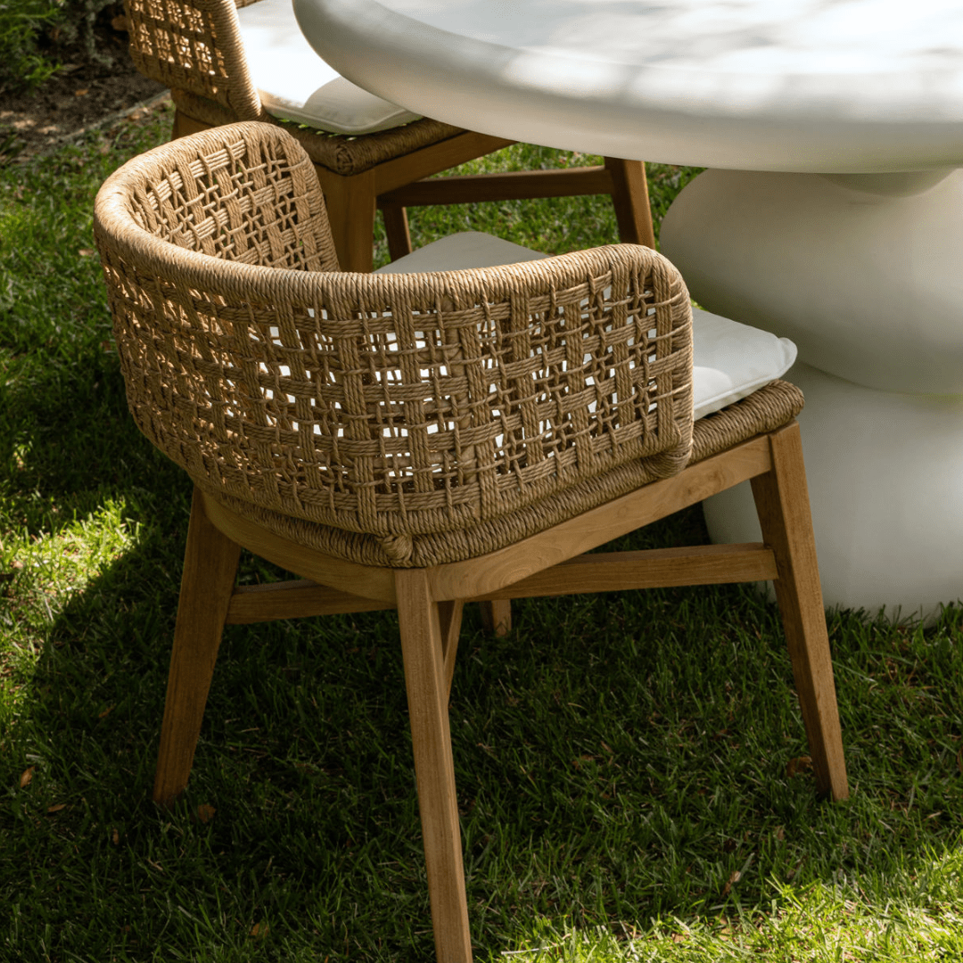 Kaila brings a little extra comfort to outdoor dining. Made from solid teak with a woven rope seat and plush olefin cushions, this chair balances durability with an easygoing feel. The slatted back adds structure, while the neutral tones fit right in, no matter the setting. Designed for the outdoors but happiest under a covered patio to keep it looking its best. Sold in a set of two—because one is never enough.
