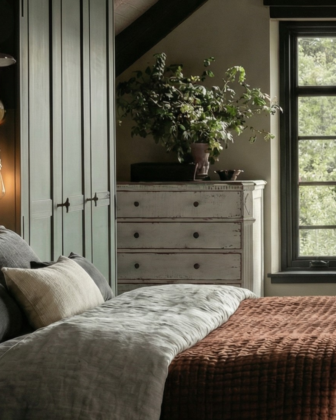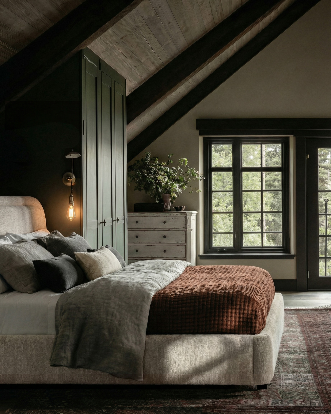 The Emerald Mountain Bedroom style guide is built around one goal: creating a bedroom that feels steady, enclosed, and visually calm. This look relies on a restrained palette of deep green, warm wood, and softened neutrals to reduce visual noise and support rest. It’s less about decoration and more about how each choice contributes to a grounded, functional retreat.