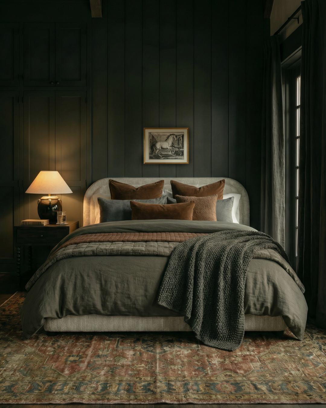 Lighting is treated as a design tool, not an afterthought. Warm, low-level lighting replaces overhead brightness to maintain a consistent, evening-friendly atmosphere. Textiles stay tactile but controlled: linen bedding, wool or cotton throws, and rugs with subtle pattern or texture rather than high contrast. The result is a bedroom that feels cohesive, quiet, and intentional from every angle.