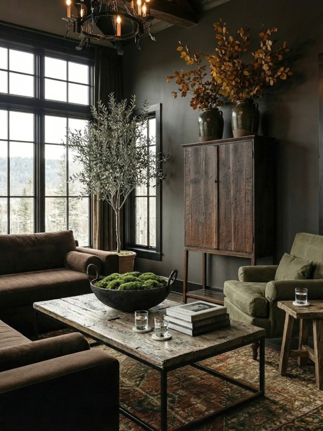 Start with natural anchors. In the kitchen, that means vintage-inspired wood boards, stoneware, and glassware that feel substantial and meant for use, not display. In the living area, upholstered seating in earthy tones provides softness without breaking the palette. Olive green, warm neutrals, and textured surfaces repeat across both spaces to keep the rooms visually connected rather than segmented.