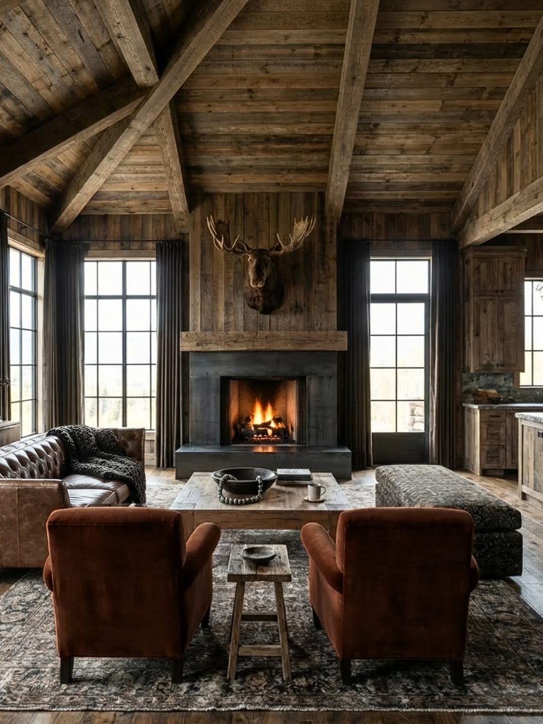 The coffee table is solid. The fireplace is heavy. The beams above echo that same structure. Your brain reads all of it as stable — like nothing is going to move or surprise you. That matters more than style.