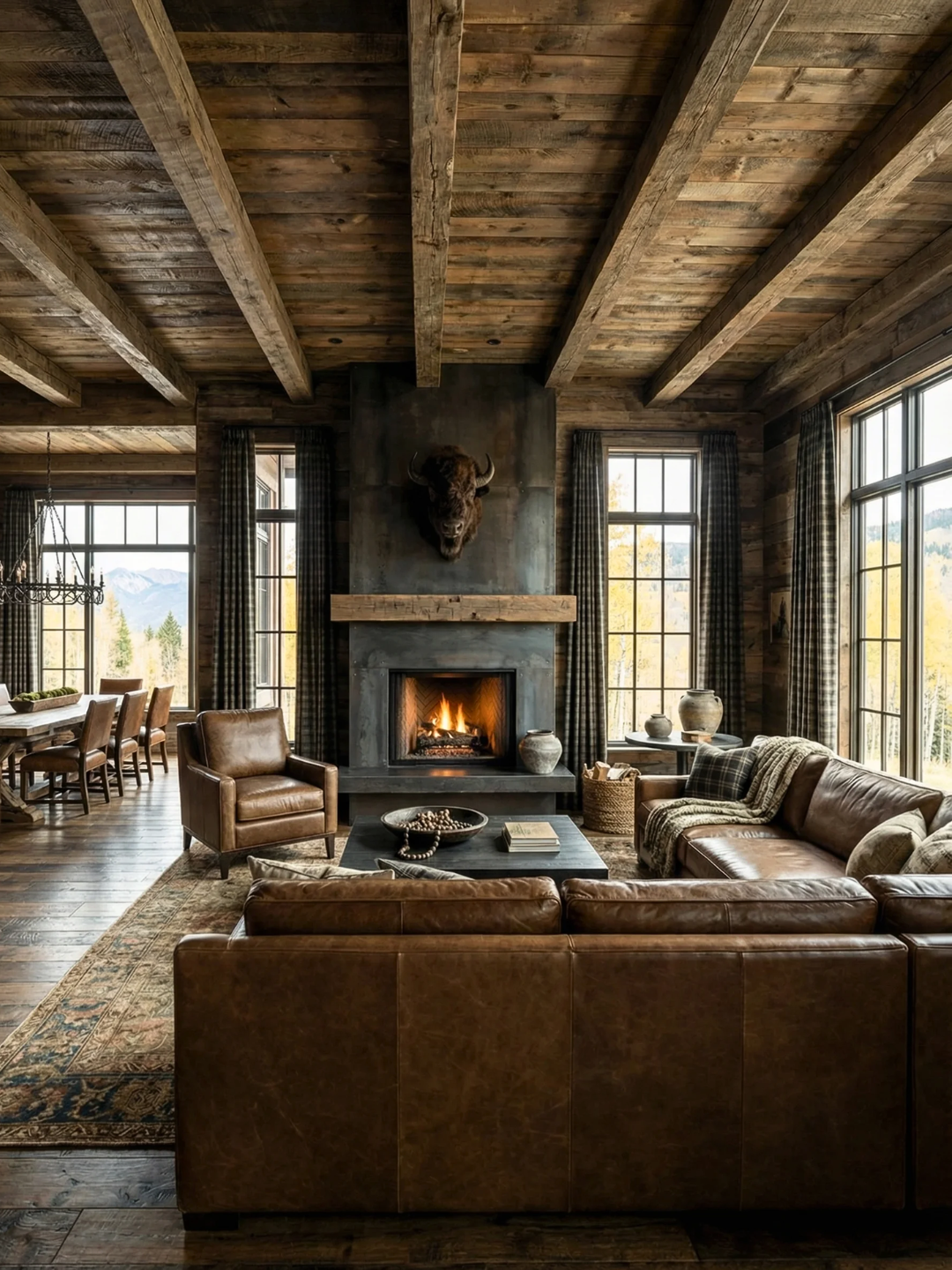 Material and color stay controlled. Leather, aged wood, and muted tones repeat across the room. The Ruthie Leather Chair absorbs light, while the wood elements carry the same depth throughout. No sharp contrast. No visual spikes.