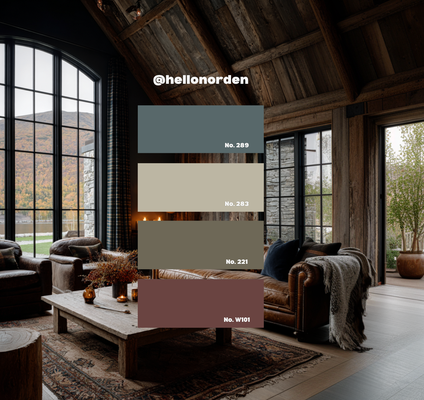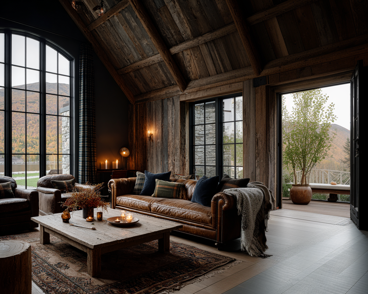Layering two tones of brown leather is one of my favorite tricks — it keeps the space feeling warm and collected, not matchy. Add a refined plaid curtain for pattern, and let the texture do the rest: reclaimed beams, stone fireplace, aged wood tables. This is how you use a color palette to guide every choice — whether you’re painting, furnishing, or finishing a room.