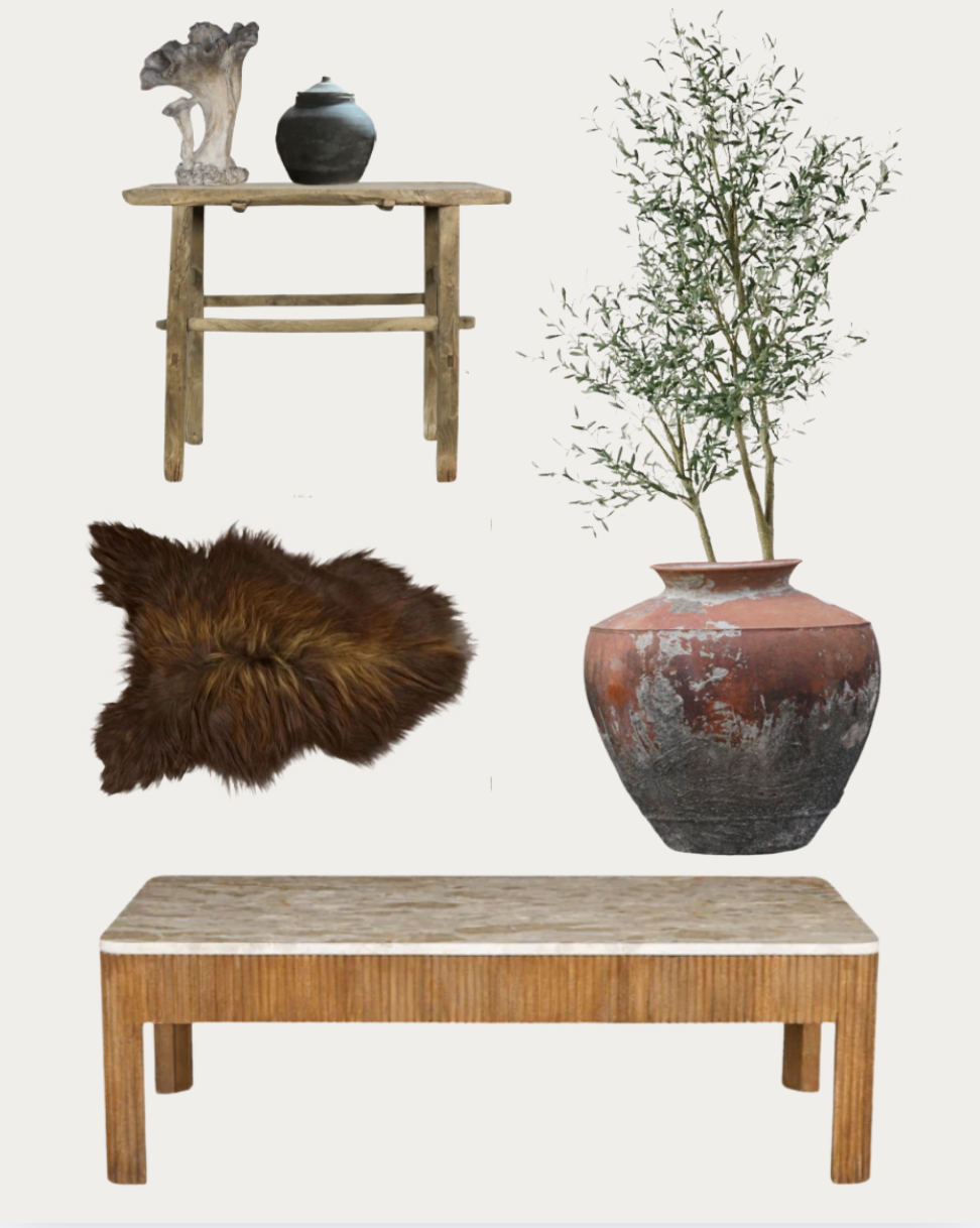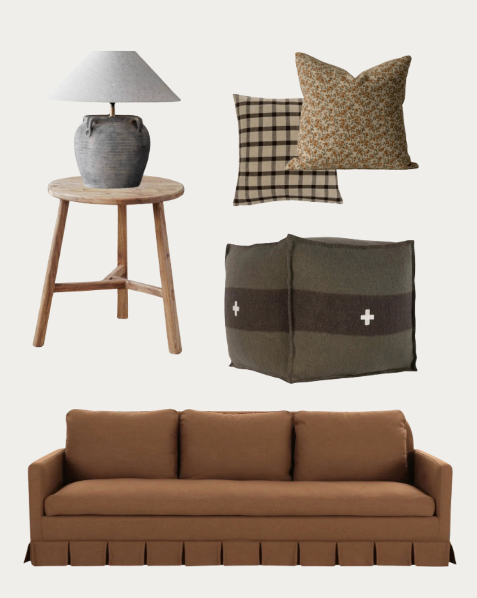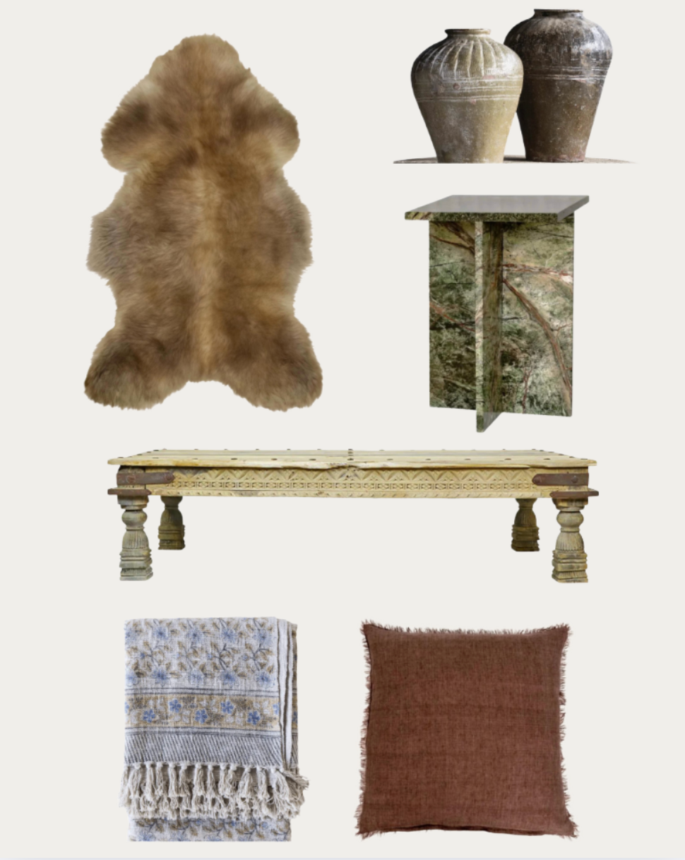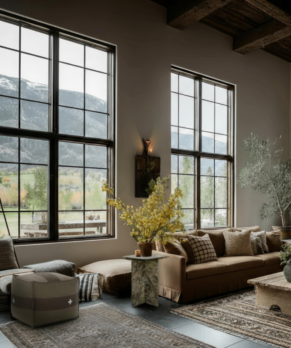 This living room balances rugged warmth with quiet refinement. Stone, wood, and worn textures play against soft cushions, gathered textiles, and a skirted sofa that doesn’t take itself too seriously. It feels curated but casual — like the kind of space where you kick your boots off and stay awhile.