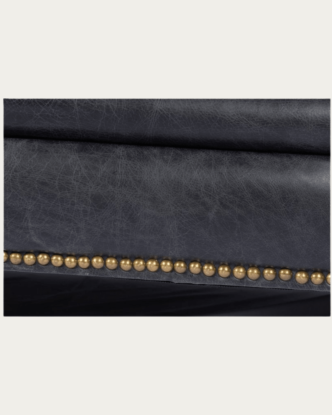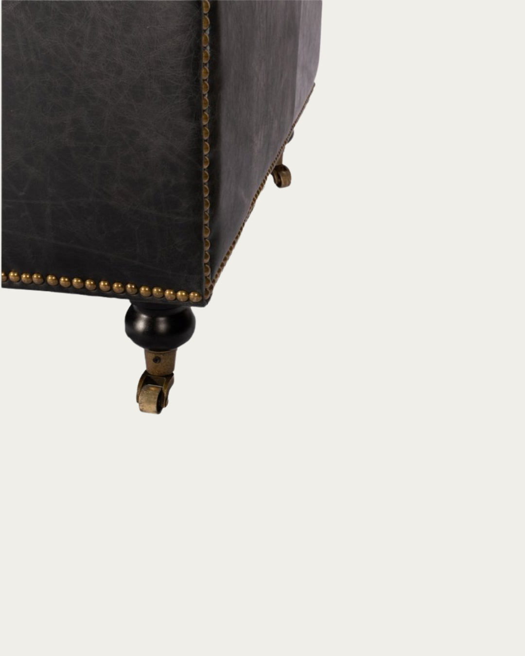 UPHOLSTERY: TOP-GRAIN LEATHER, HARDWOOD AND PLYWOOD FRAME, BRASS CASTERS ON SOLID WOOD FEET, HIGH-DENSITY FOAM