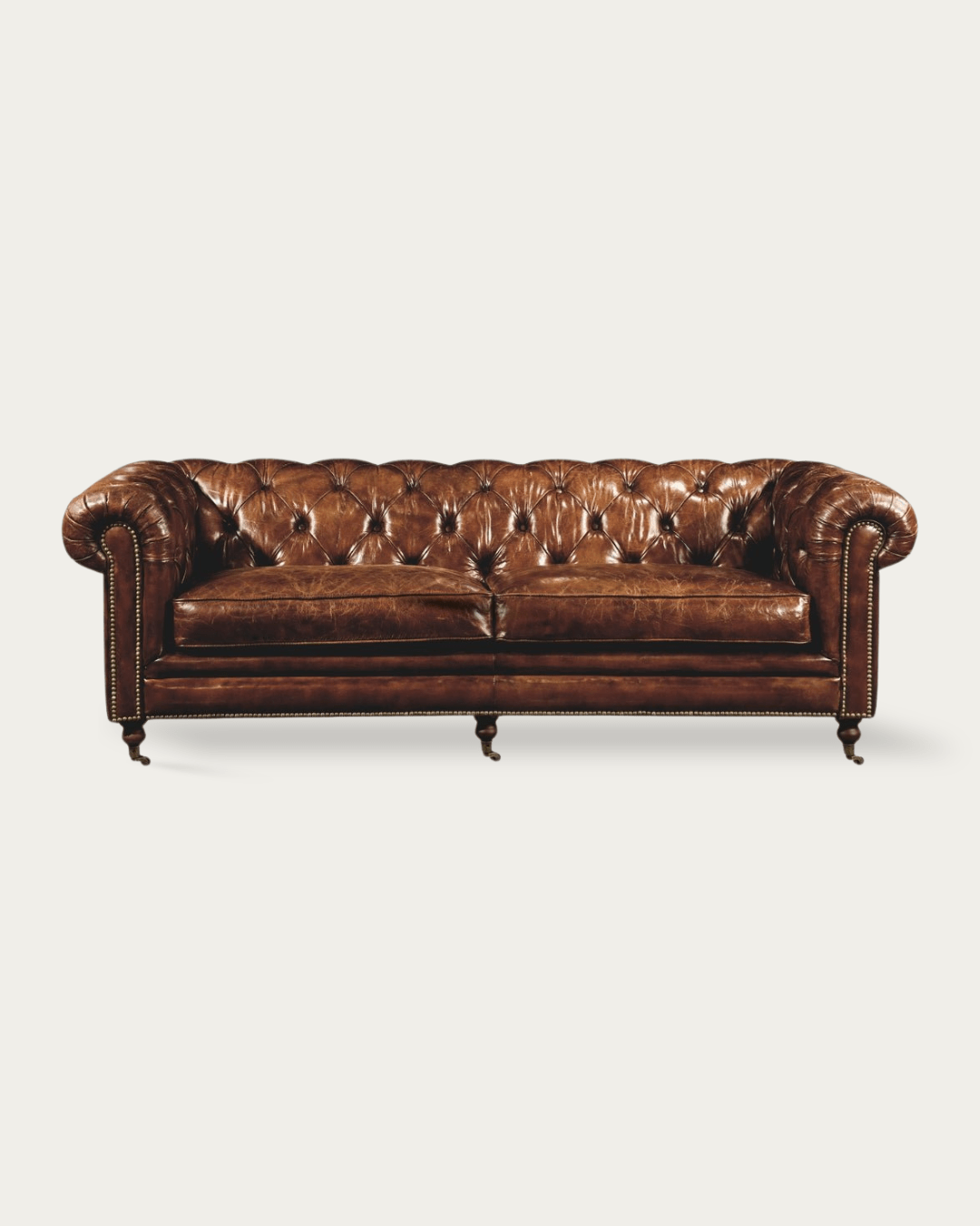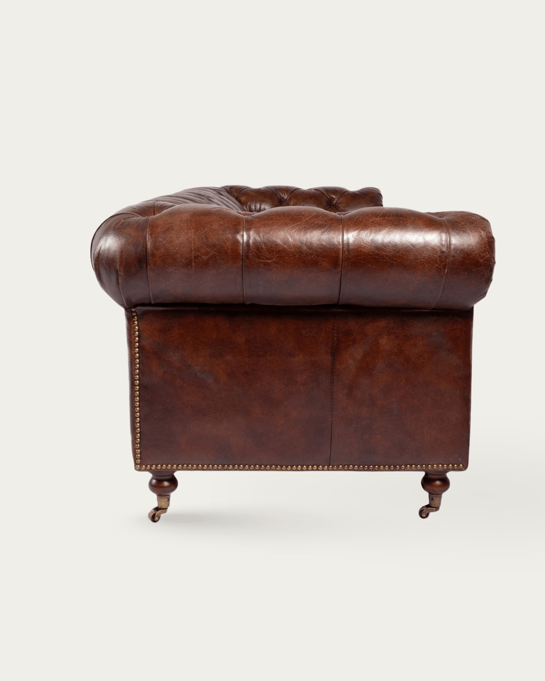 Capturing the bold elements of traditional design, the Bergen chesterfield sofa adds sophistication to your living space with its top-grain leather. Sharp details are apparent in the Chesterfield's tufted back, rolled arms, and meticulously placed brass detailing.