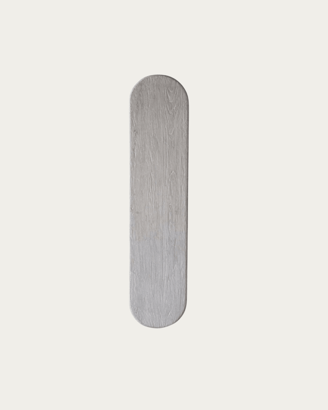 The Carle console oval table features a contemporary design with interlocking legs that create a stylish open base. One leg is a rounded rectangular frame extending the full length of the table, while the other consists of two U-shaped legs connected by long slats that support the tabletop. Crafted from elm wood and finished in a whitewash, the Carle console table combines elegance with a modern touch.
