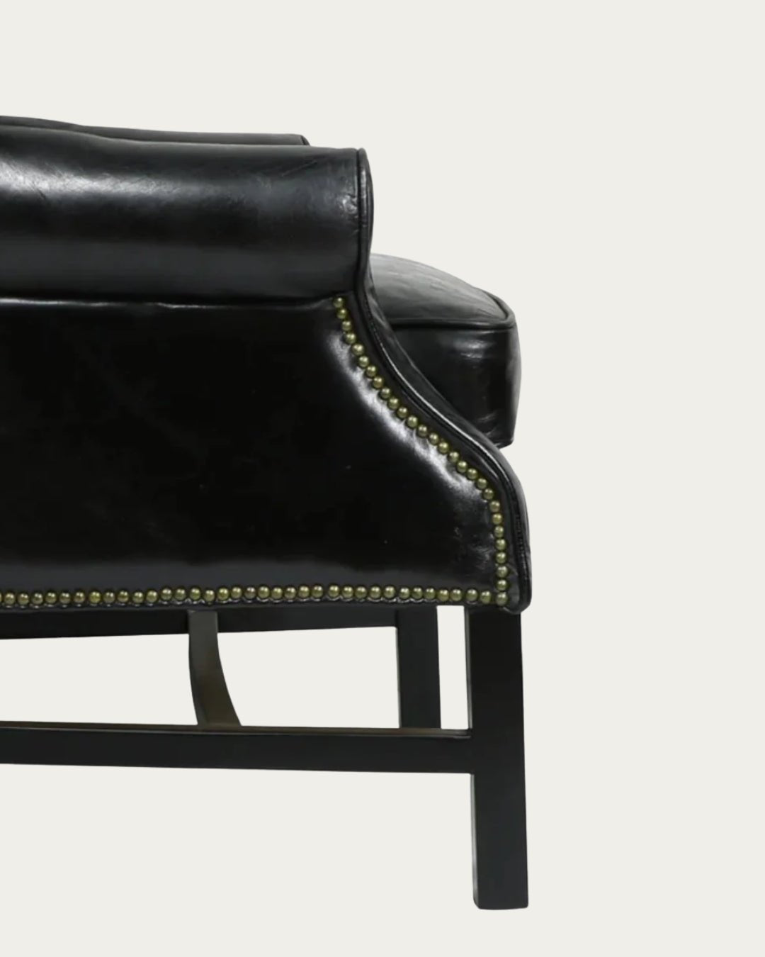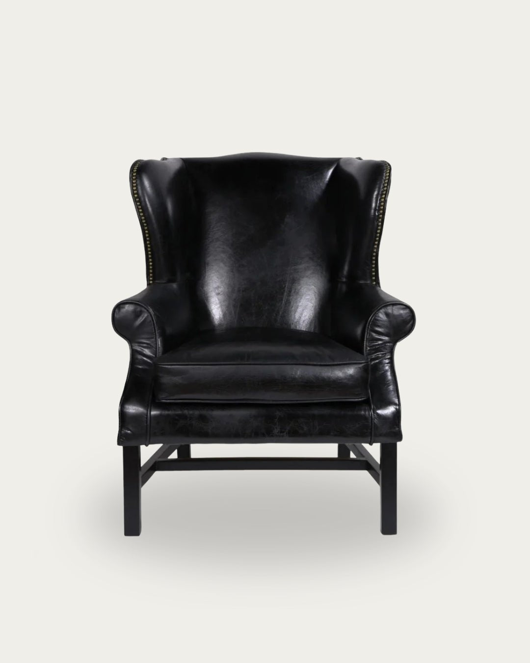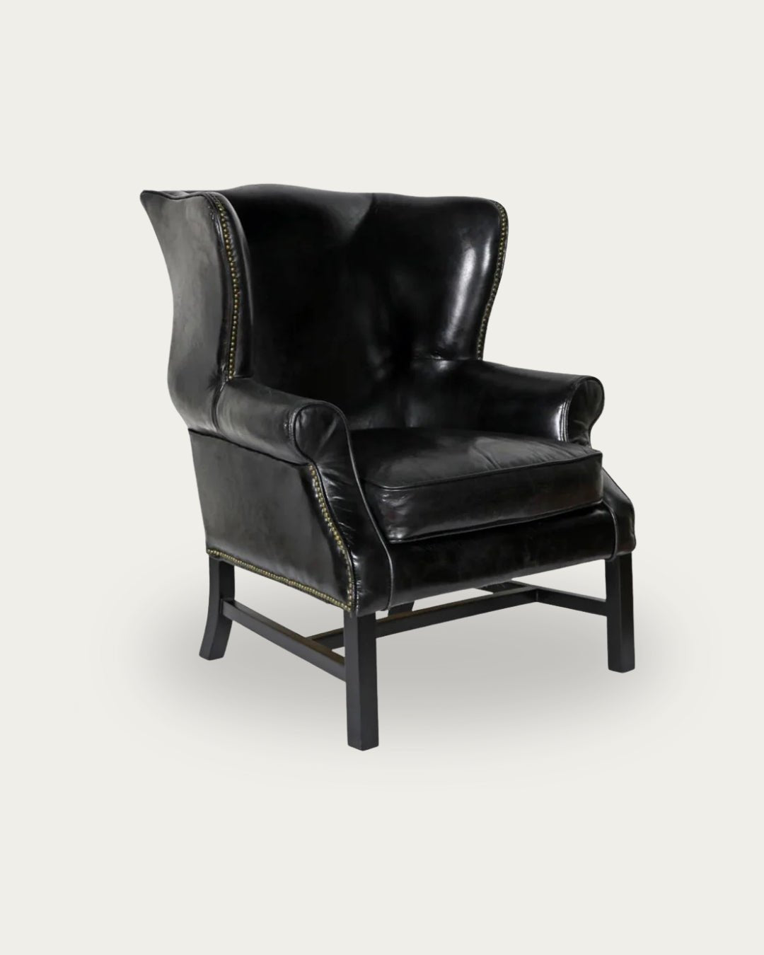 Our Holmes black leather wingback chair makes a statement in any space with its rich-black, Italian-leather upholstery and hand-rubbed wood legs. Present as a solo piece, or create drama with a matching set. This is a stunning piece, just imagine the drama in an office or living space.