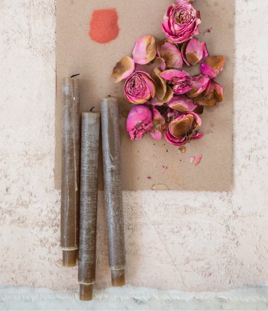 These unscented, pleated taper candles with a powder finish are an effortless way to add both style and ambience to any home. They're perfect for intimate gatherings, dinners, and parties. Or if you're like us, you never light them and keep them as decor! the powder and ribbed texture is perfect.