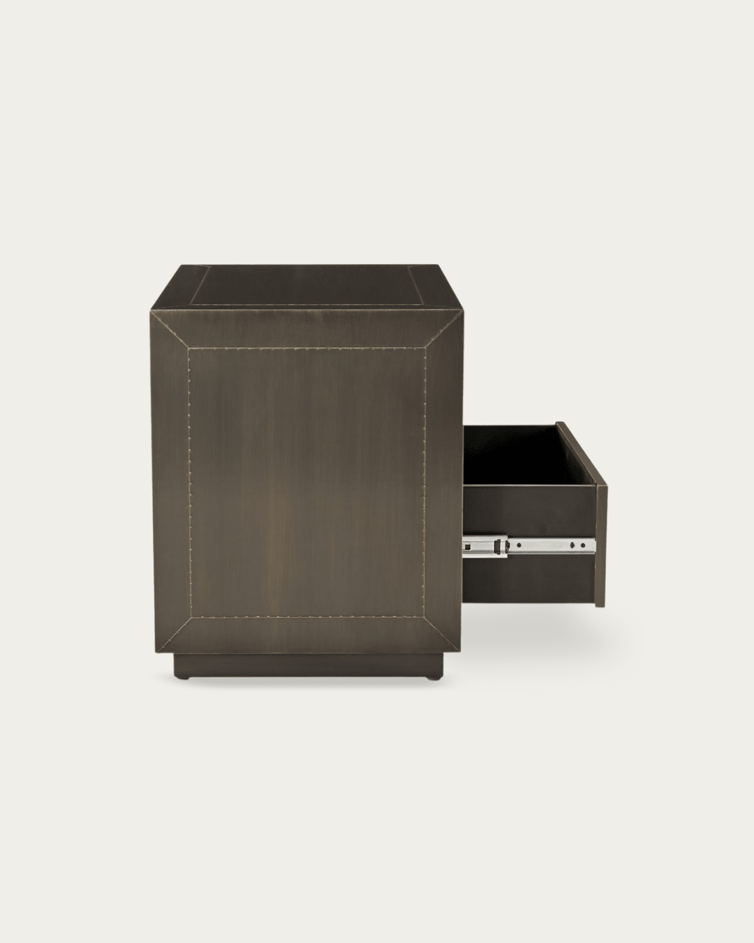 The Veli nightstand is crafted from MDF and hand-cladded brass metal sheeting with a deep bronze finish. Visible join lines and subtle patina give each piece its own look. It has push-to-open drawers with side-mounted glides for easy access and a clean front. No assembly is needed—just unbox and use.
